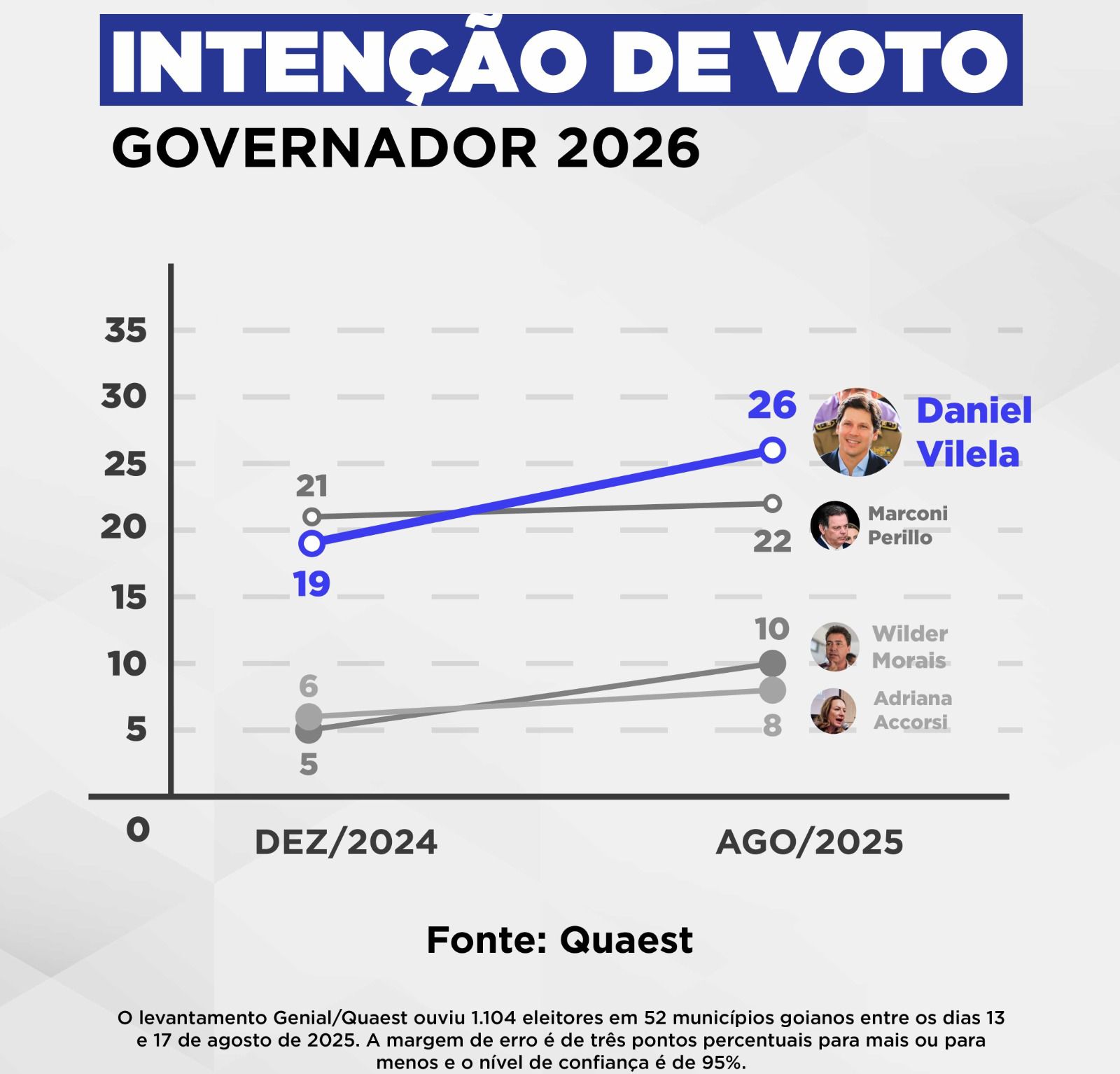 O vice-governador Daniel Vilela (MDB) assumiu a dianteira na disputa pelo governo de Goiás em 2026 e aparece como favorito do eleitorado goiano, aponta a pesquisa Genial/Quaest divulgada nesta sexta-feira (22/8). O emedebista registra 26% das intenções de voto, sete pontos percentuais a mais do que na sondagem divulgada em dezembro de 2024, quando tinha 19%.