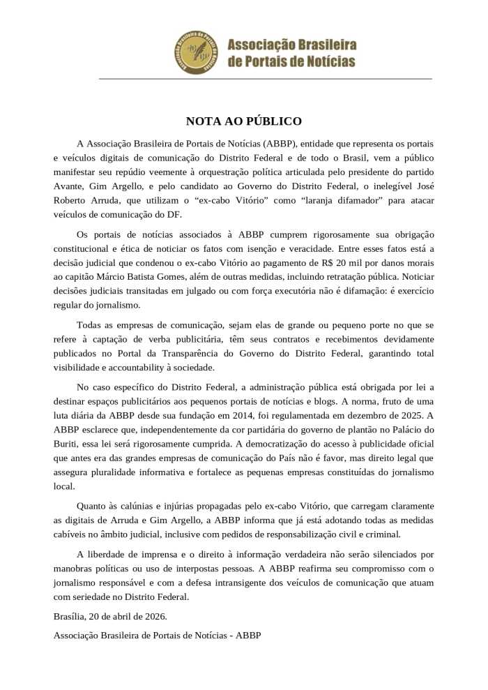 A Associação Brasileira de Portais de Notícias (ABBP) divulgou nesta segunda-feira (20) uma nota pública de forte posicionamento institucional em defesa dos veículos digitais de comunicação do Distrito Federal e do país. No documento, a entidade afirma existir uma articulação política com objetivo de atacar a credibilidade de portais independentes e questionar o exercício regular da atividade jornalística.